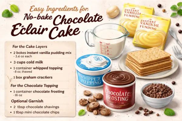 You only need a few easy ingredients to make a tasty no bake chocolate eclair cake at home. These amounts are based on the most common method used in popular versions of the recipe, with slight adjustments to keep the filling thick, smooth, and easy to layer.