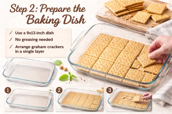 Take out a 9×13-inch baking dish and make sure it is clean and dry. There is no need to grease it. Start laying graham crackers across the bottom of the dish in a single layer. Cover as much of the base as you can. Break a few crackers into smaller pieces if needed so the surface is mostly covered. A neat base layer helps every slice hold together better once chilled.