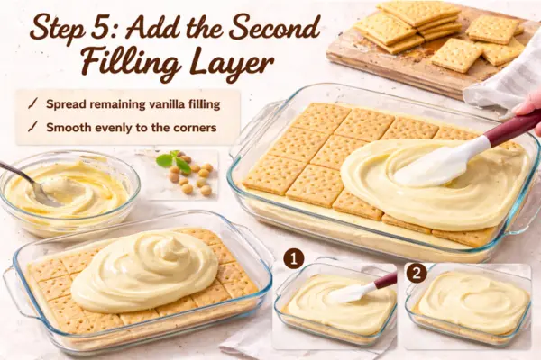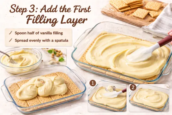 Spoon half of the vanilla filling over the graham crackers. Use a spatula to spread it gently from edge to edge. Try not to drag too hard across the crackers, especially at the beginning, because they can shift. A soft hand works best here. Once spread, the layer should look even and smooth.