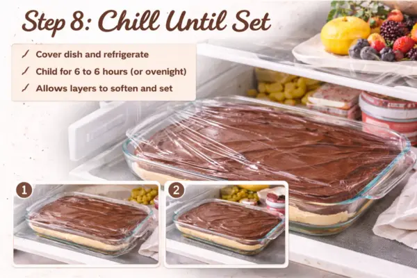 Cover the dish with plastic wrap or a lid and place it in the refrigerator for at least 6 to 8 hours. Overnight is even better. This chilling time is very important because it allows the crackers to soften and the layers to set properly. If you cut it too early, the dessert will not have that soft, cake-like texture people expect from a good eclair cake.
