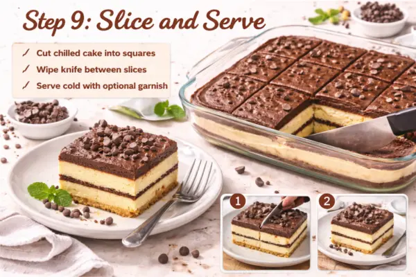 Once fully chilled, remove the cake from the fridge and let it sit for a few minutes before slicing. Use a sharp knife to cut neat squares. Wipe the knife between slices if you want cleaner edges. Serve it cold for the best texture and flavor. If you like, add a little chocolate shaving or a few mini chocolate chips on top just before serving.