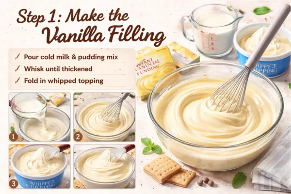 Pour the cold milk into a large mixing bowl. Add both boxes of instant vanilla pudding mix. Whisk for about 2 minutes, or until the mixture looks smooth and starts to thicken. You want it thick enough to hold its shape a little, but still soft enough to spread. Let it rest for 2 to 3 minutes so it can firm up slightly.